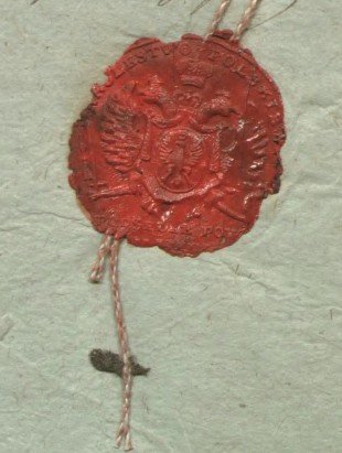 Stempel lakowy użyty w Pilicy w r. 1819 Wyraźnie widoczny dwugłowy orzeł i inne szczegóły