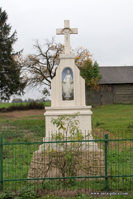 11.1 Skrzyżowanie w centrum wsi - Figura kamienna z 1906r.na rzeźbionym postumencie.Wmiejscu zniszczonej głowy ustawiono małą figurkę Madonny.Na postumencie płaskorzeźby świętych na froncie duży wizerunek św. Jerzego [?], po bokach między innymi św. Jan Nepomucen. Napis:Fundatorowie Jan i Franciszka Grabowscy Na cześć i chwałę Panu Bogu i Maryj 1906r.