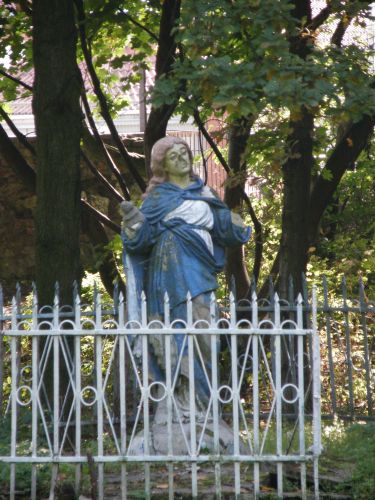 4.8 Kamienna Figura Matki Boskiej Niepokalanie Poczętej umieszczona na czworobocznym postumencie, murowanym,otynkowanym z polichromowanymi płaskorzeźbami przedstawiającymi postaci świętych. Powstała około 1900 roku.