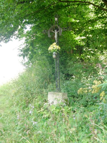 4.12 Krzyż przydrożny metalowy, kuty. Na krzyżu ceramiczna figurka Chrystusa. Postawiony w 1926 roku z fundacji Franciszka Czecha.