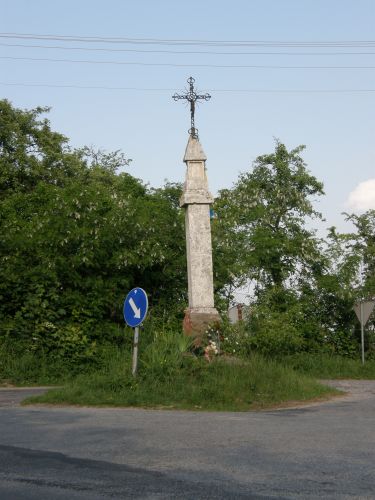 7.1 Skrzyżowanie dróg koło kościoła. Kamienny słup zwieńczony metalowym krzyżem.